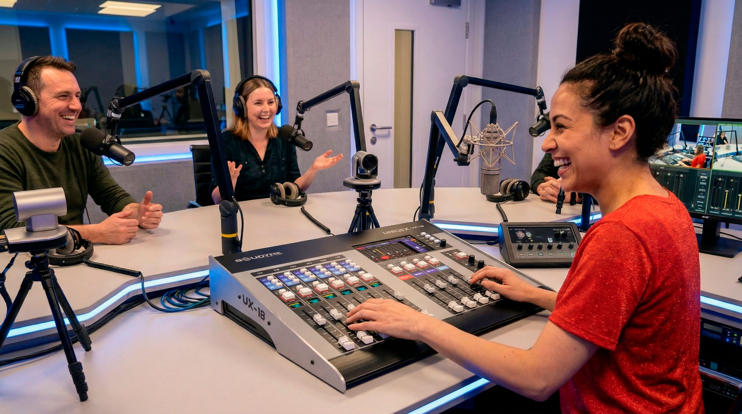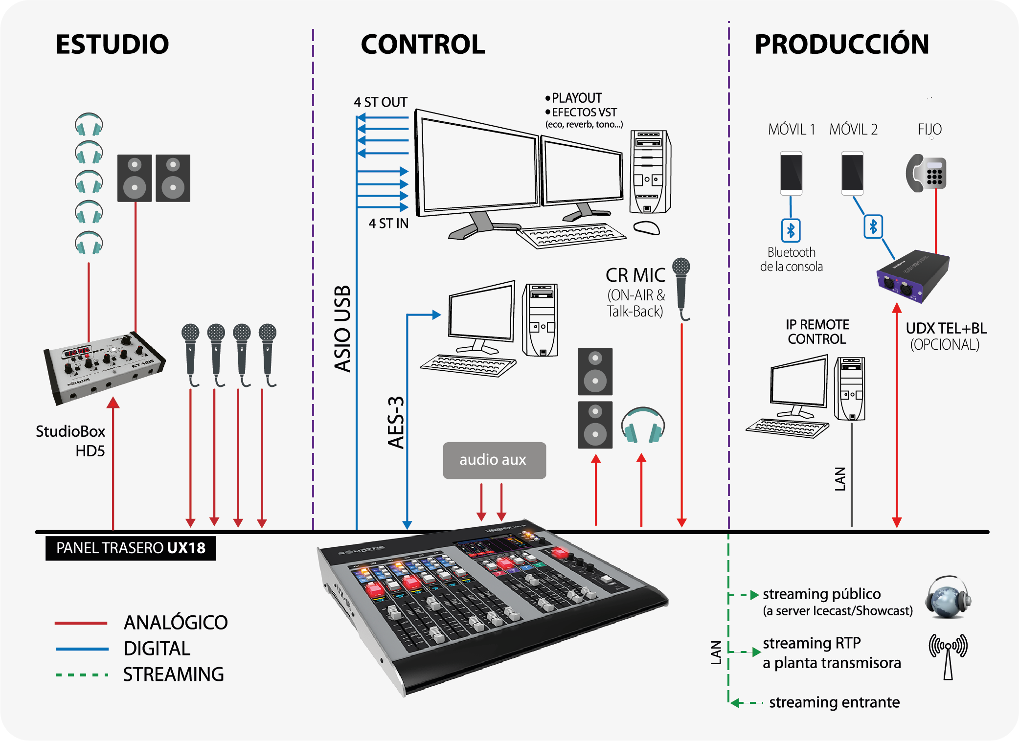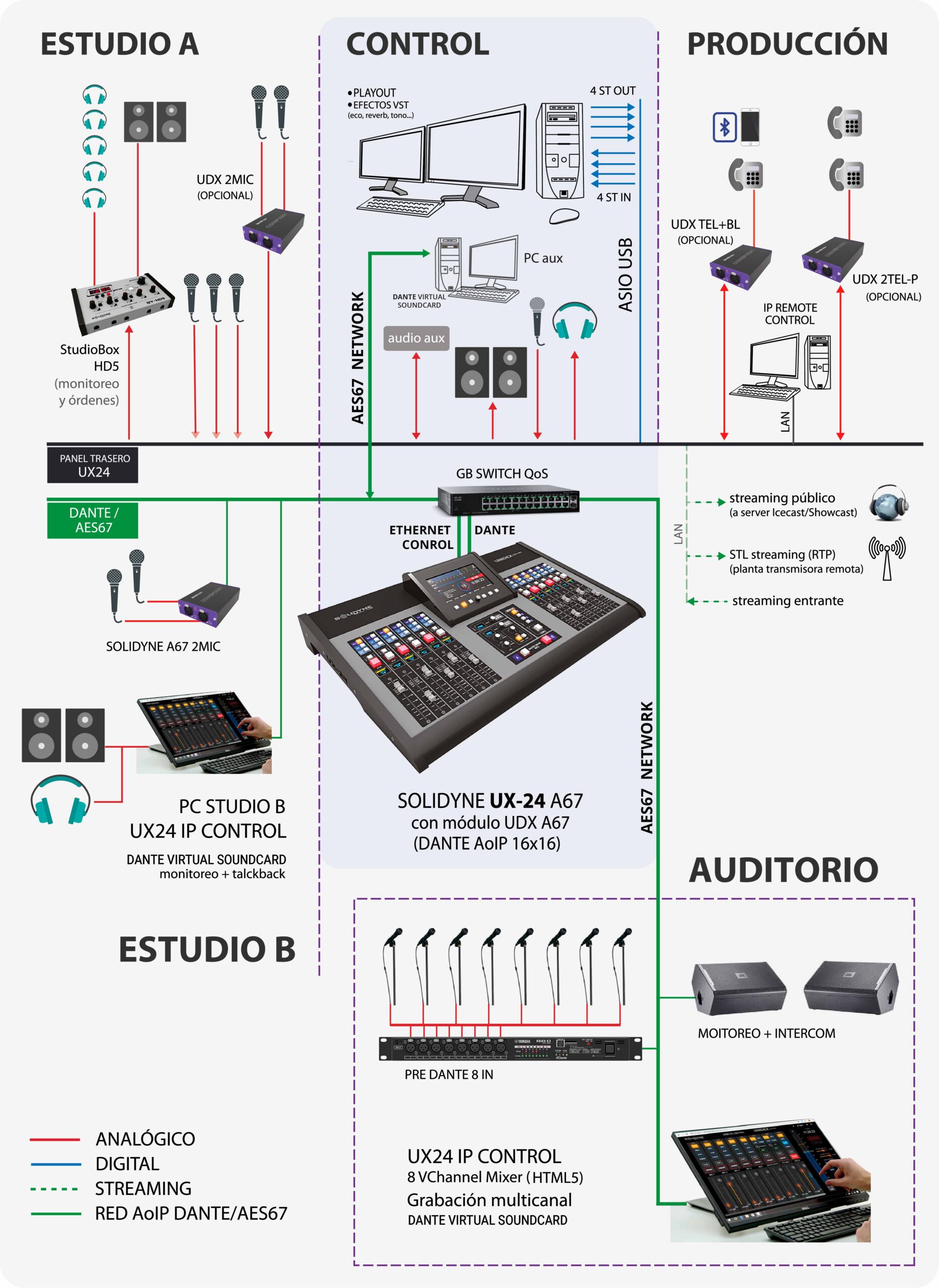 Una consola UNIDEX UX24 aprovechada al máximo permite operar multiples configuraciones de estudios. Una instalación versátil que combina conexiones directas analógicas, digitales y audio en red DANTE.